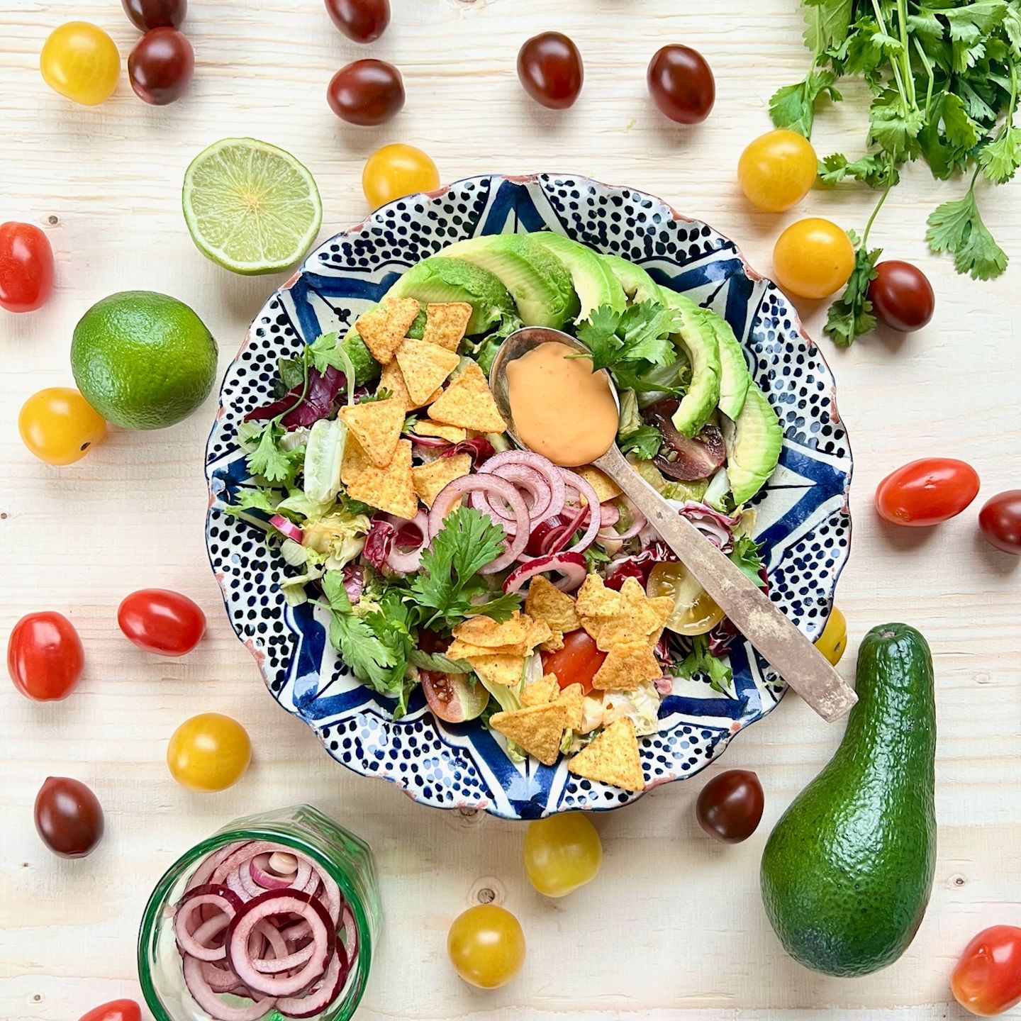 Sega kokku salatikastme koostisosad, kalla kaste salatile ja sega läbi. Jaga salat kahte kaussi ja tõsta kummagi peale pool krevettidest.