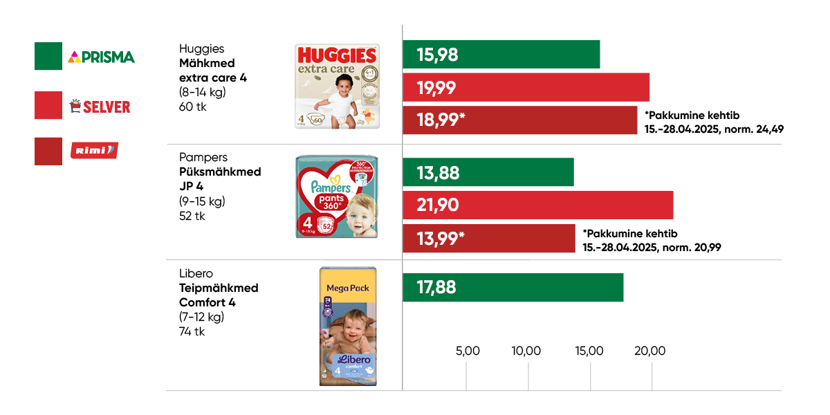 „Meie sortimendis on üle 740 imikuhooldustoote, mis tähendab et langetame hindu 80% protsendil selle kategooria artiklitest. Keskendume eelkõige juhtivatele kaubamärkidele, nagu Huggies ja Põnn, ning keskmiseks hinnalanguseks saab olema 16%. Osade toodete hinna alanevad lausa 50%,” rõhutas Teemu Kilpiä. Prisma eesmärk on olla 20% soodsam kui meie konkurentide keskmine hinnatase.
